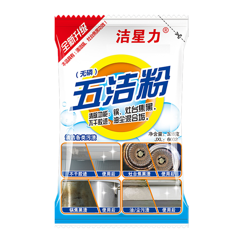 拿整袋潔星力五潔粉躺著來回晃動10下打開袋口,取一半倒入碗中,加上清水調配成膏狀,涂抹在污漬上,用清潔抹布或徒手擦拭即可,然后用清水沖洗干凈。